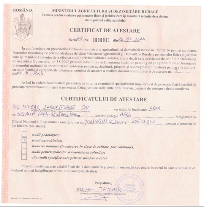Ca urmare a respectarii acestor principii si a unui proces complex de implementare a sistemului de management al calitatii, laboratorul este acreditat de catre ASOCIAŢIA DE ACREDITARE DIN ROMÂNIA- ORGANISMUL NAŢIONAL DE ACREDITARE (RENAR), pentru analize de sol
